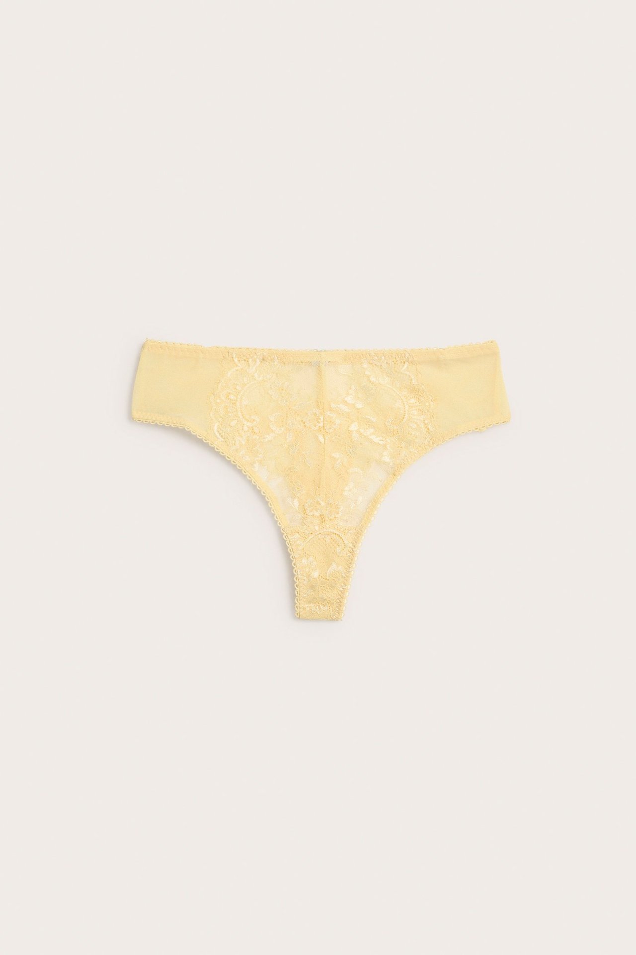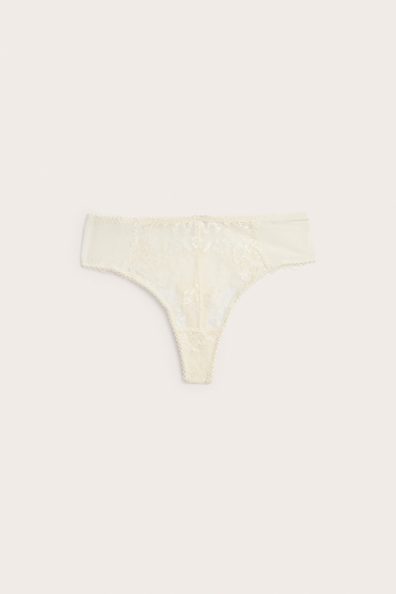 Pehmeästä materiaalista valmistettu stringimalli, jossa on koristeellista pitsiä edessä. Pitsissä on kaunis kukkakuvio.