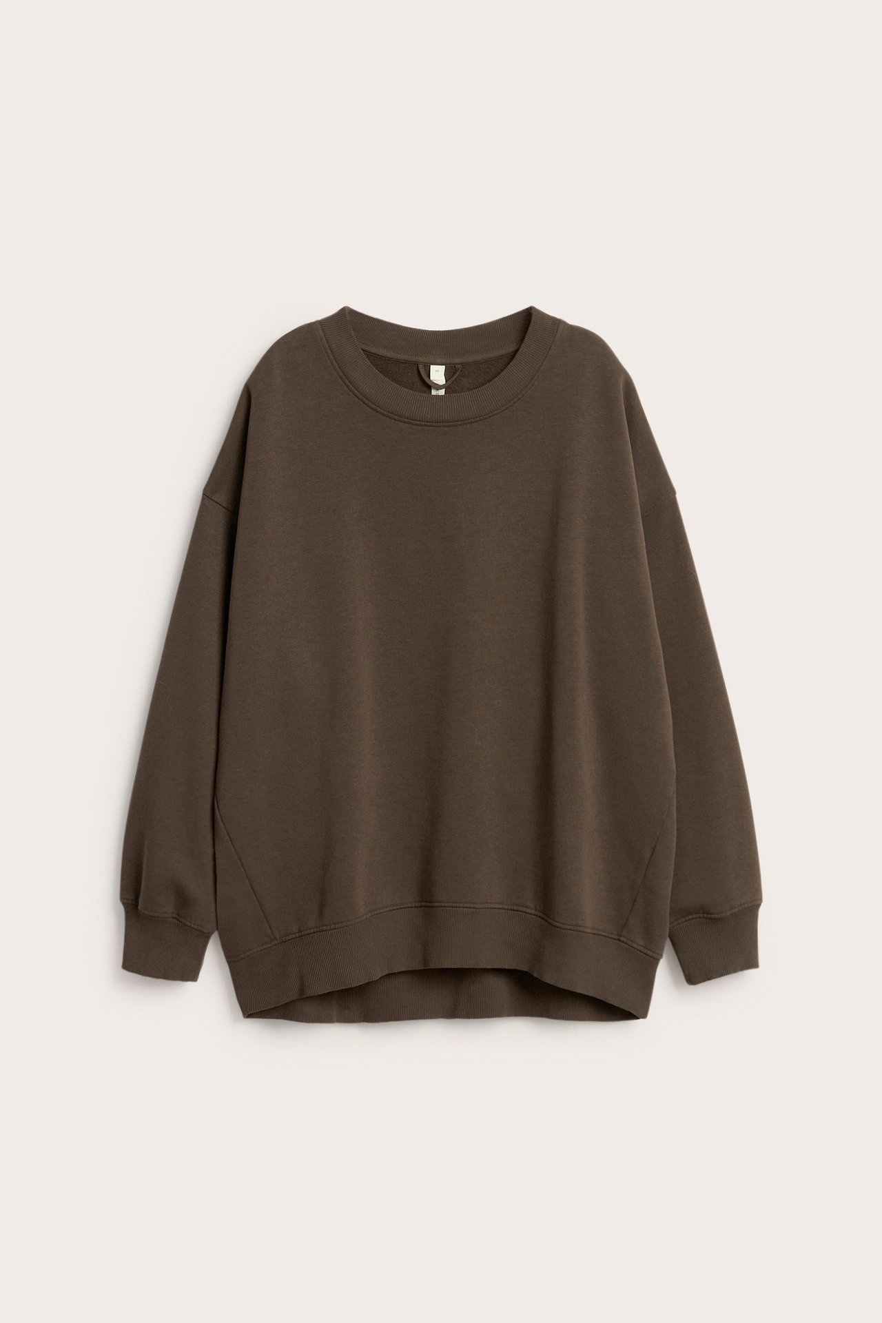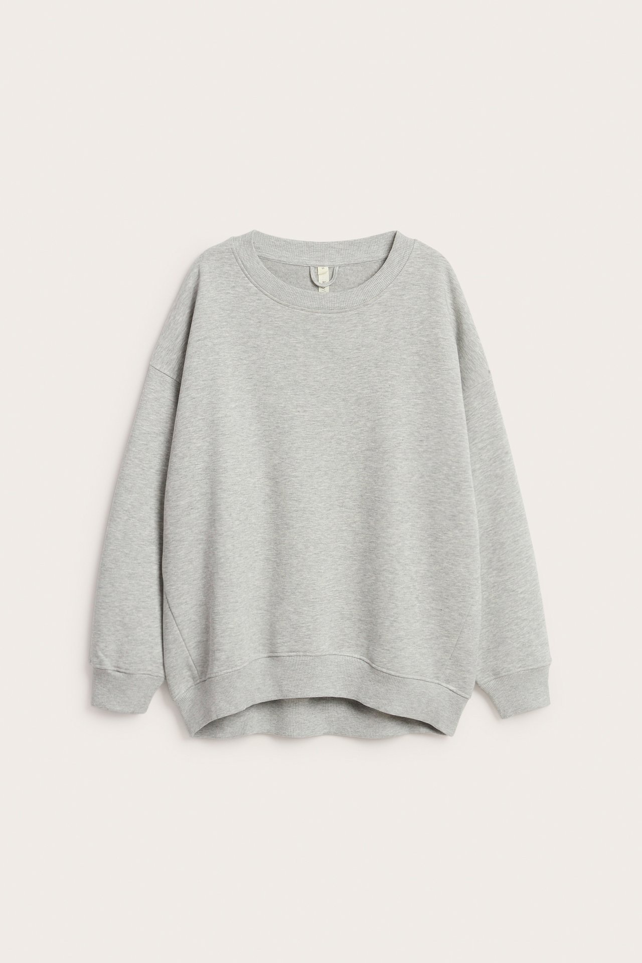 Pehmeää puuvillaa oleva pitkä kay/day-collegepaita. Paidassa on harjattu sisäpuoli ja ribatut pääntie, helma ja hihansuut. Puserossa on leveä istuvuus ja lasketut olkapäät. kay/day Ajaton mallisto, johon kuuluu hienoin yksityiskohdin somistettuja yksinkertaisia vaatteita. Istuvuus on väljä. Mukavia vaatteita treeneihin, kävelylenkeille, matkalle tai kotona oleskeluun.