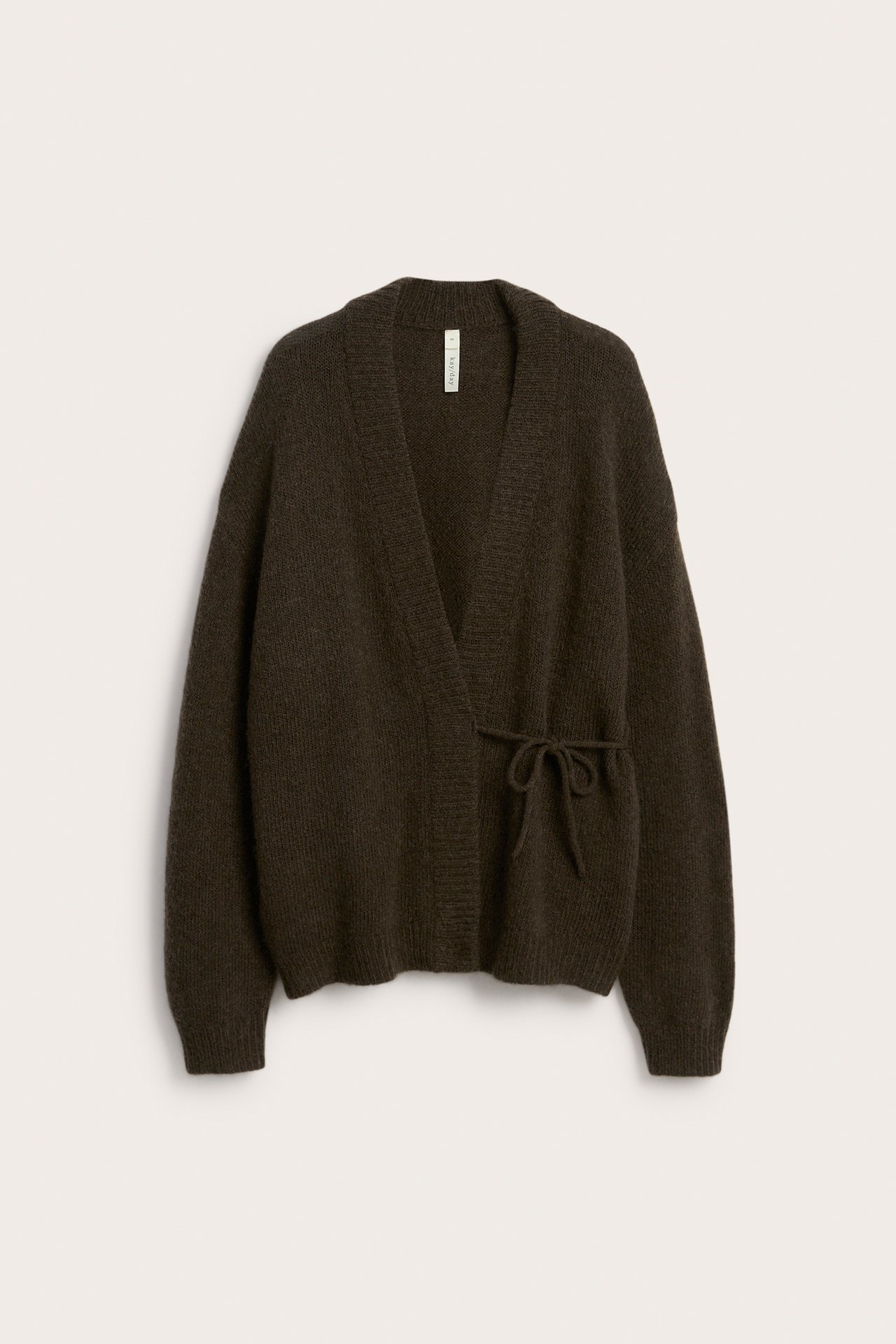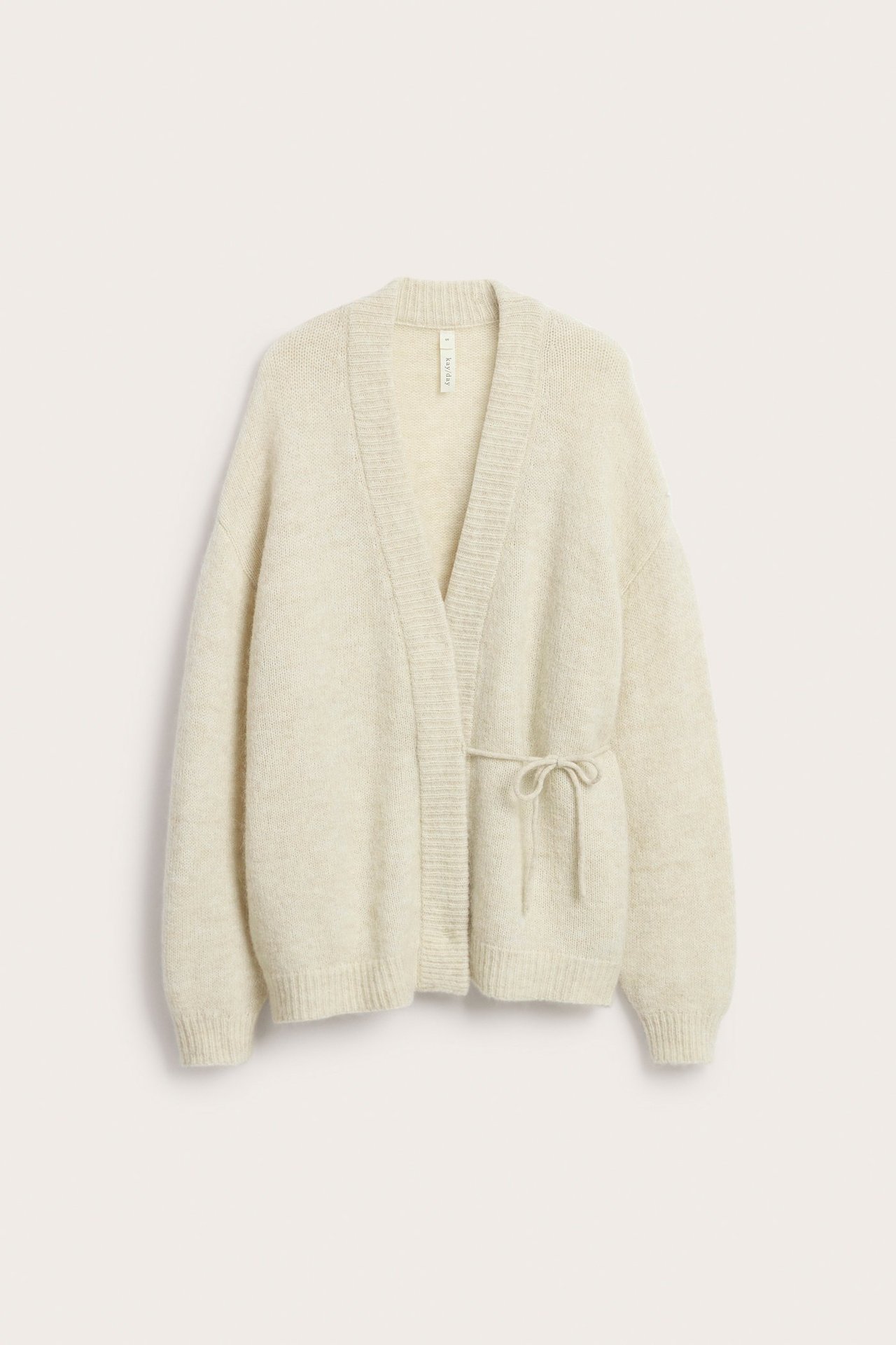 Pehmeä villasekoitetta oleva neuletakki, jossa on solmittava nauha. Neuletakissa on väljät hihat ja istuvuus sekä ribatut hihansuut ja reunat.