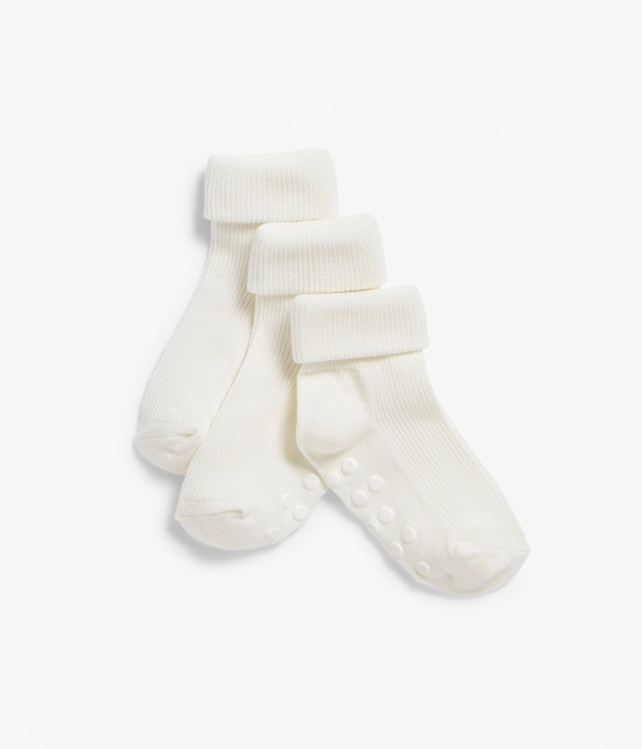 3 parin pakkaus yksivärisiä vauvojen sukkia. Sukissa on ribattu taitettu reuna, joka voidaan suoristaa. Luistonestopohjat kokonumeroissa 16/18 ja 19/22.