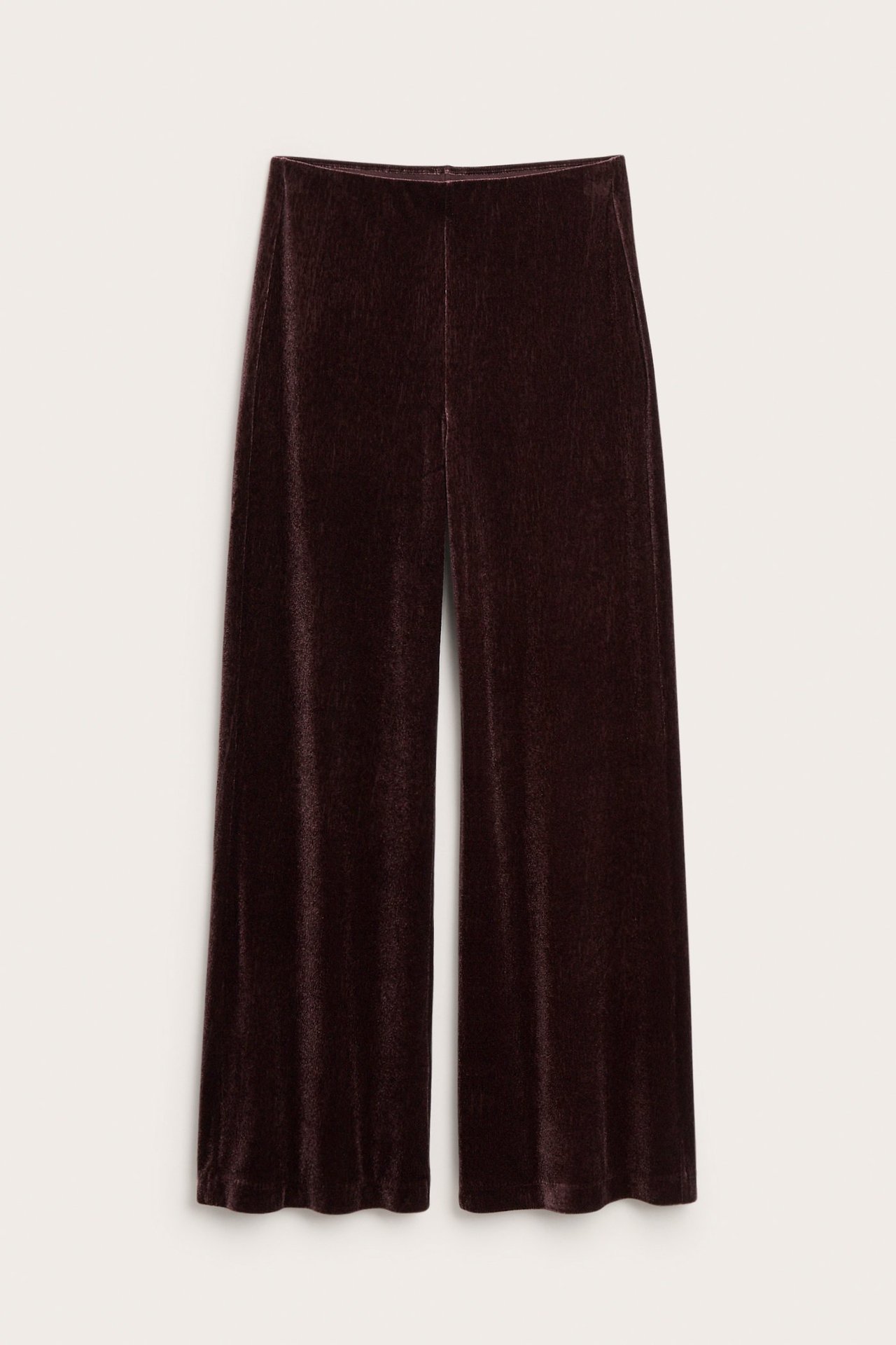 Bukse i myk velur med brede ben og rett passform. Modellen har skjult strikk i midjen og fald med usynlig søm nederst.