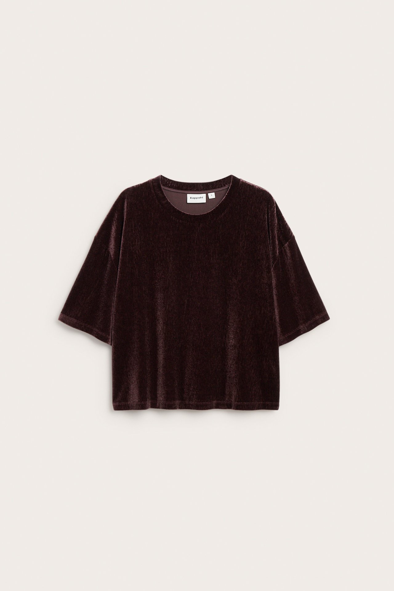 Kortermet topp i myk velur med rund hals og romslig passform. Modellen er noe kort.