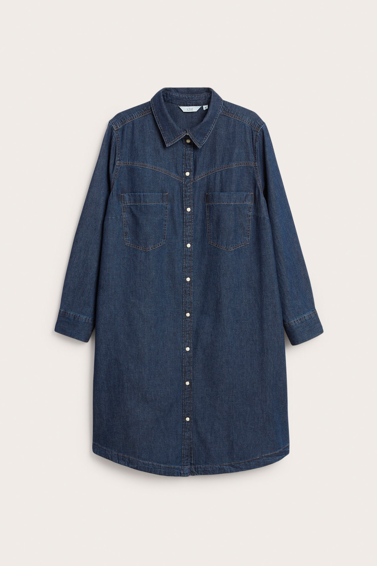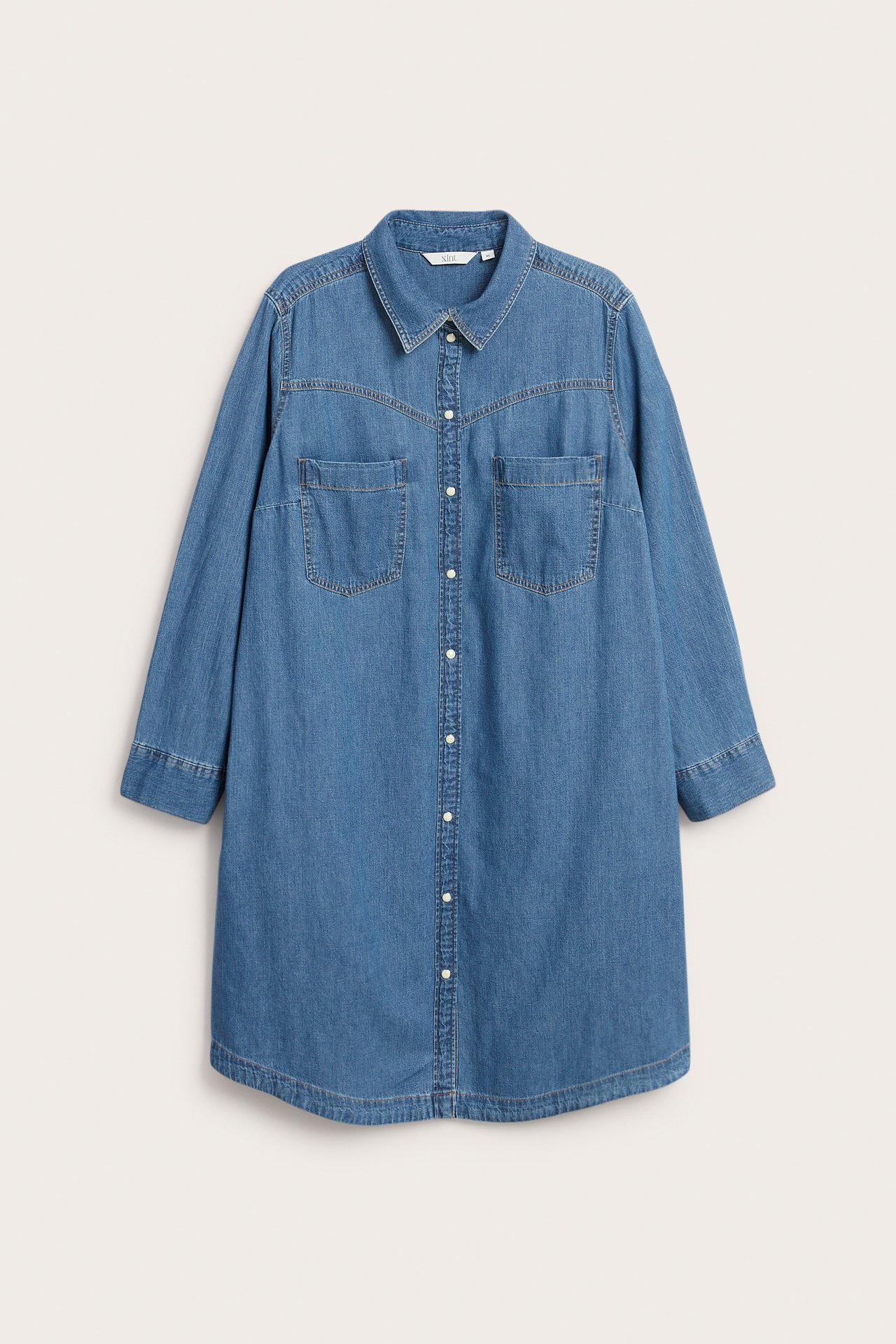 Jeanskjole i skjortemodell fra Xlnt. Skjortekjolen har en klassisk krage samt trykknapper foran og i ermeåpningene. To brystlommer med klaff, og skjulte sidelommer. Vid passform og knelang.
