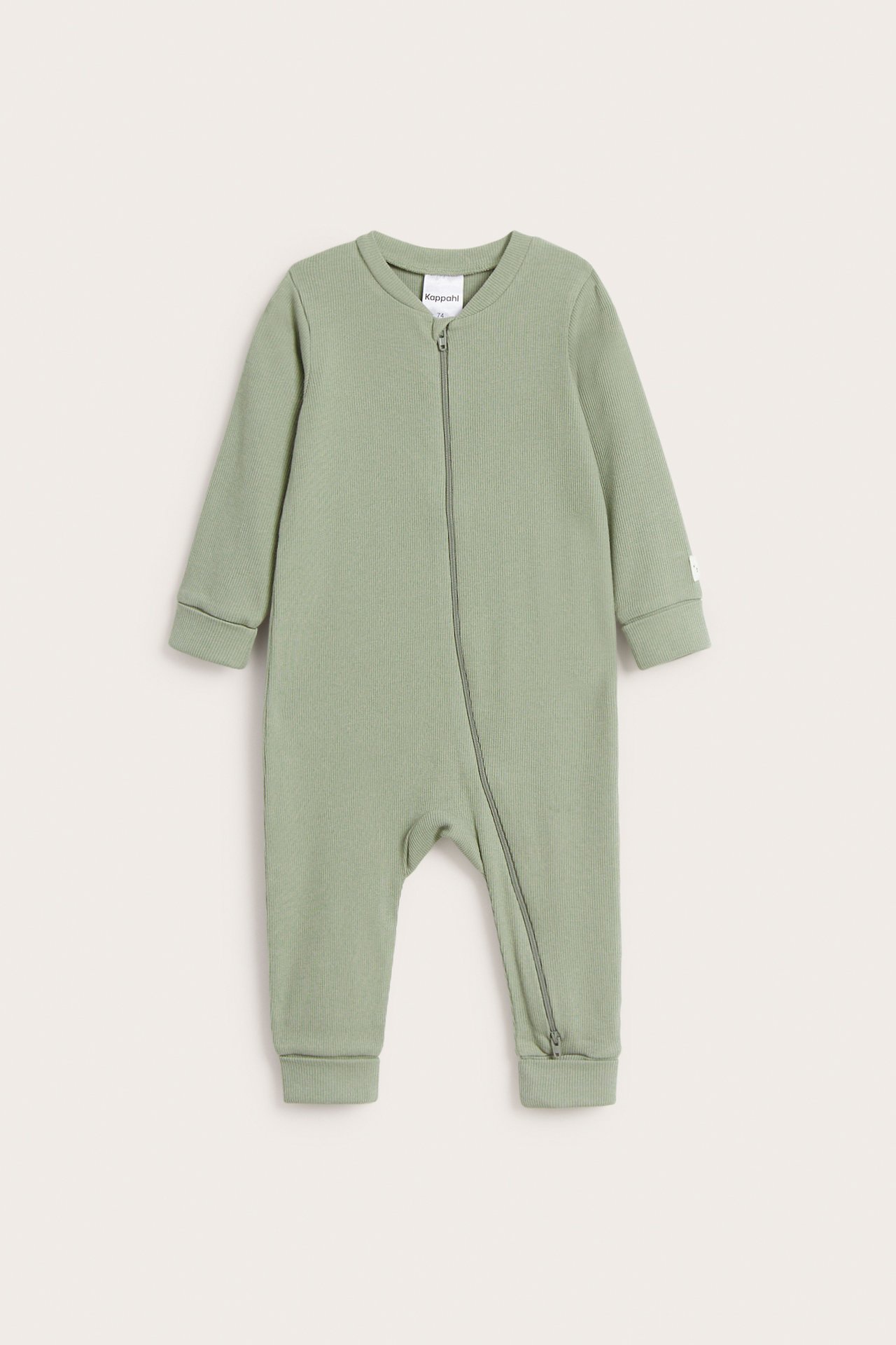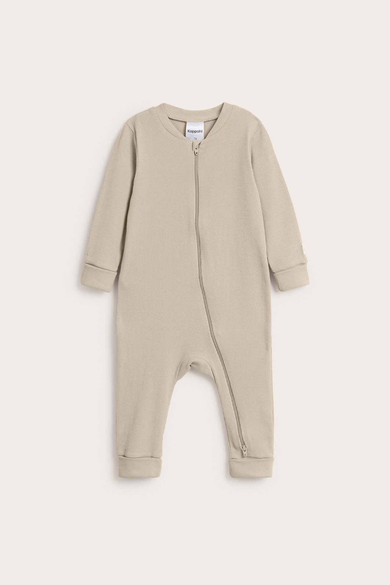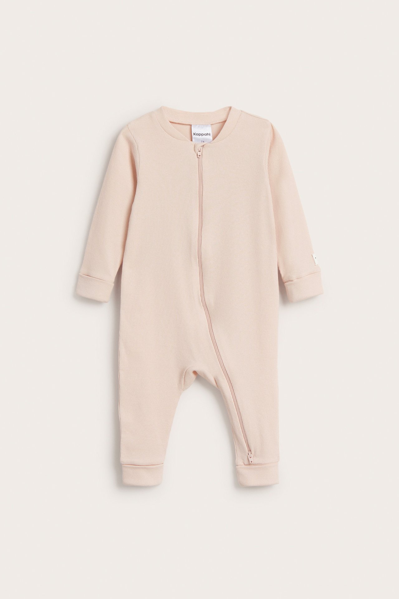 Prążkowany kombinezon dla niemowląt, z praktycznym dwukierunkowym zamkiem błyskawicznym. Produkt wykonany z wygodnej, miękkiej bawełny ekologicznej. Kombinezon ma długie rękawy i wywijane ściągacze przy rękawach i nogawkach zapewniające funkcję rośnięcia. Funkcje rośnięcia sprawiają, że niemowlę może rosnąć wraz z ubraniem, a także nosić to samo ubranie przez dłuższy czas.