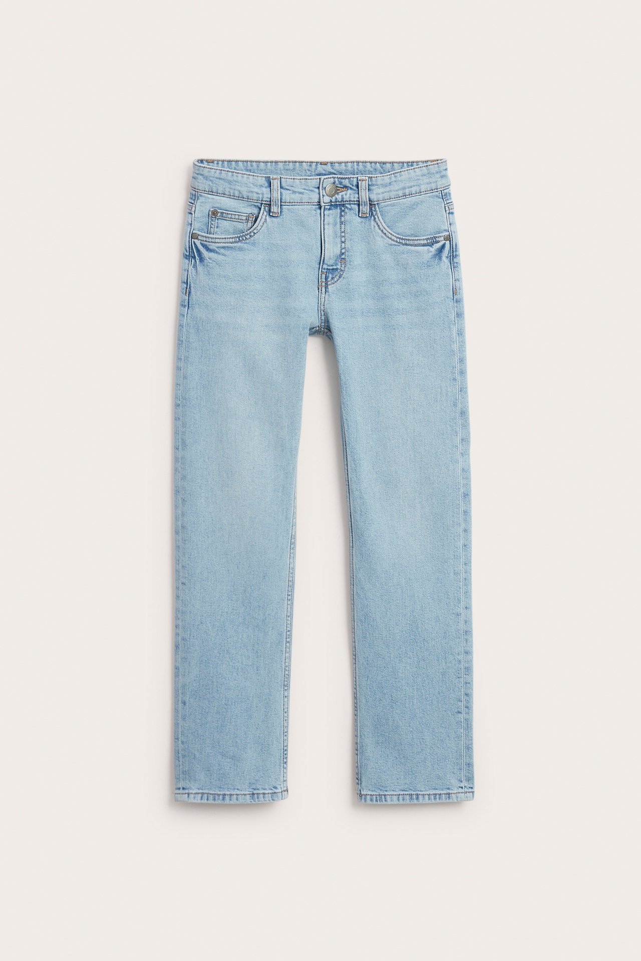 Proste spodnie ze średnim stanem, z wygodnego, rozciągliwego dżinsu. Dżinsy mają pięć klasycznych kieszeni i szlufki na pasek. Dżinsowy guzik i rozporek z zamkiem błyskawicznym z przodu oraz regulowany ściągacz po wewnętrznej stronie pasa dla optymalnego dopasowania i komfortu.