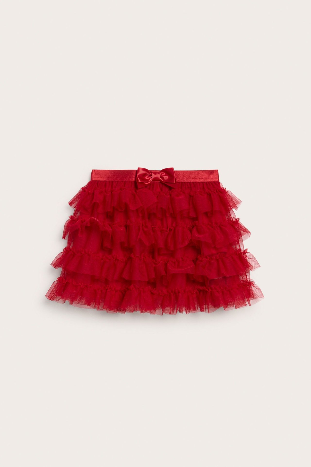 Krótka tiulowa spódnica z kilkoma przyszytymi tiulowymi falbanami. Spódnica ma satynowy ściągacz w talii i ozdobną satynową kokardę z przodu. Halka z dżerseju.