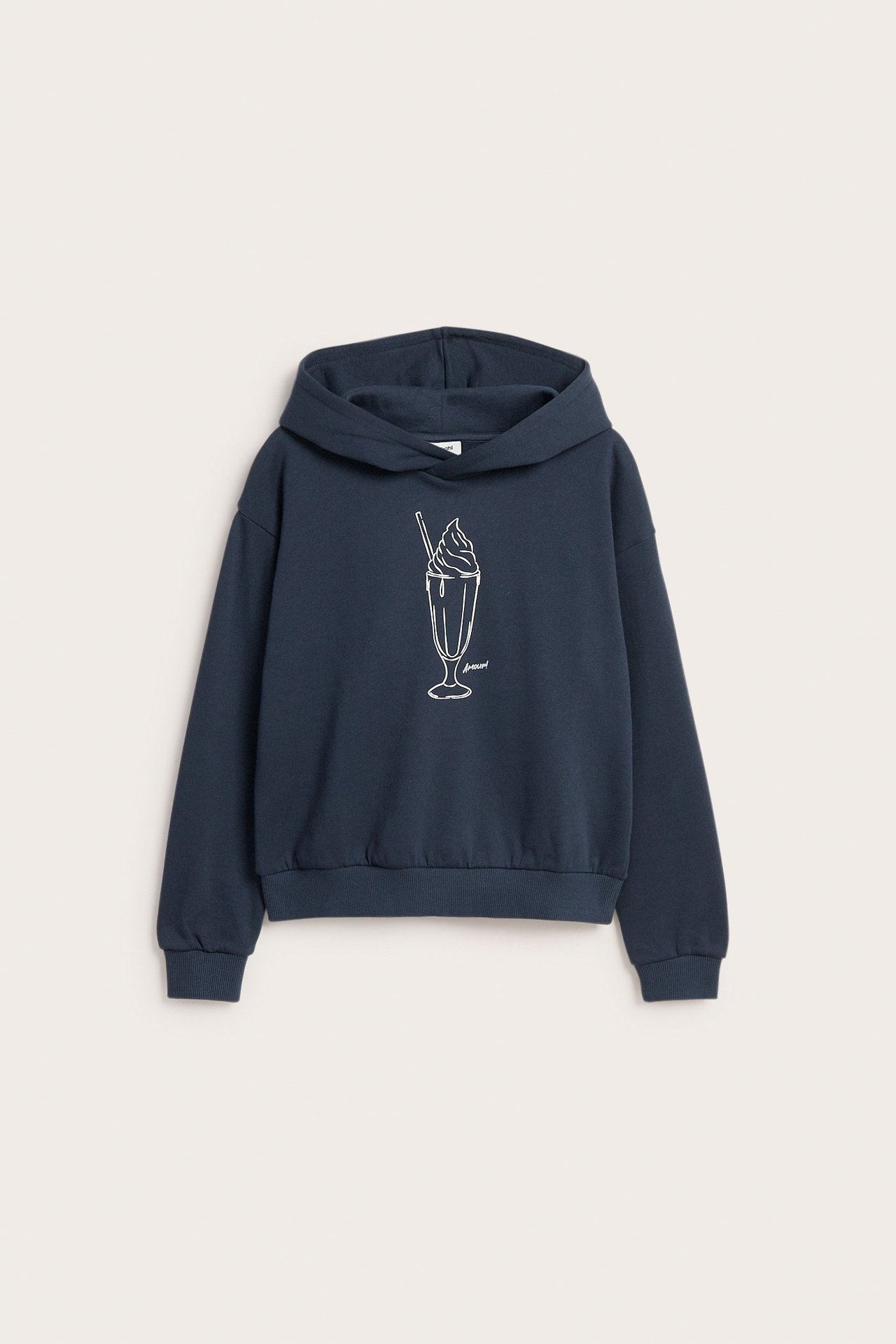 Przyjemna w dotyku bluza z kapturem, z małym nadrukiem z przodu i dużym nadrukiem na plecach. Bluza ma kaptur z podszewką oraz prążkowany ściągacz przy mankietach i na dole.
