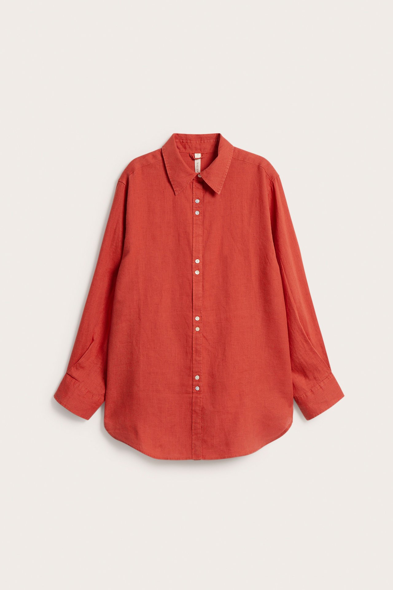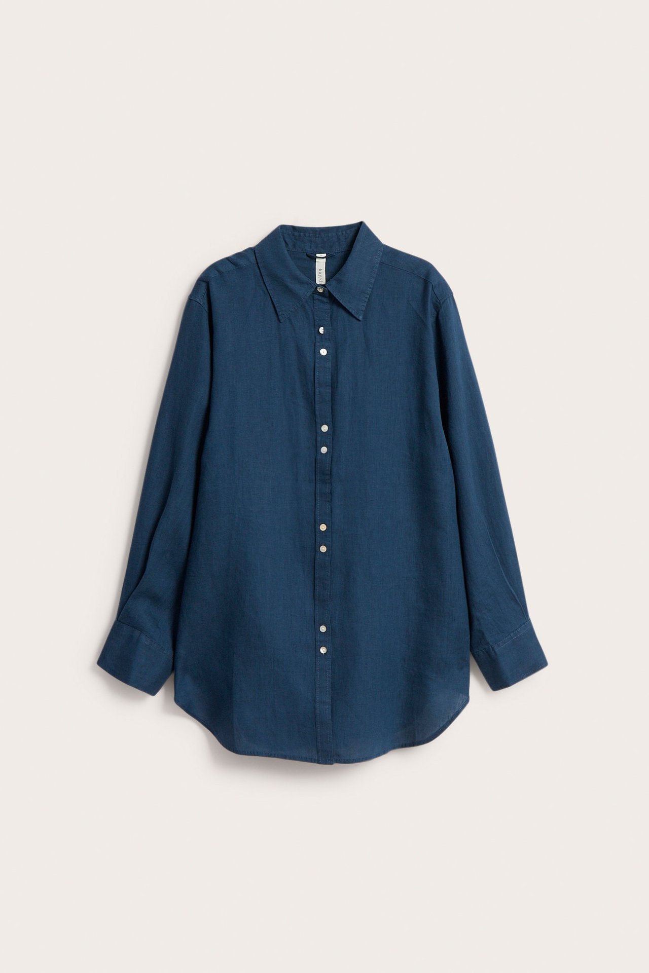 Lniana koszula oversize z zakładką z tyłu zapewniającą ładne układanie się materiału. Koszula ma guziki z masy perłowej z przodu i przy mankietach. Prosta dolna krawędź i tyłu dłuższy od przodu.