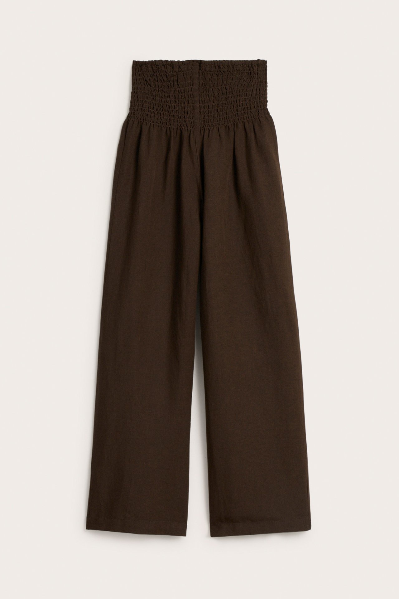 Szerokie spodnie z mieszanki chłodnego, przyjemnego w dotyku lnu. Spodnie mają wygodną szeroką gumkę w pasie.