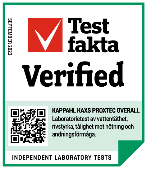 - Vinteroverallen från Kaxs har tilldelats Testfaktas kvalitetsmärkning: Verfied Quality & Performance för bra kvalitet och mycket bra vattentäthet.