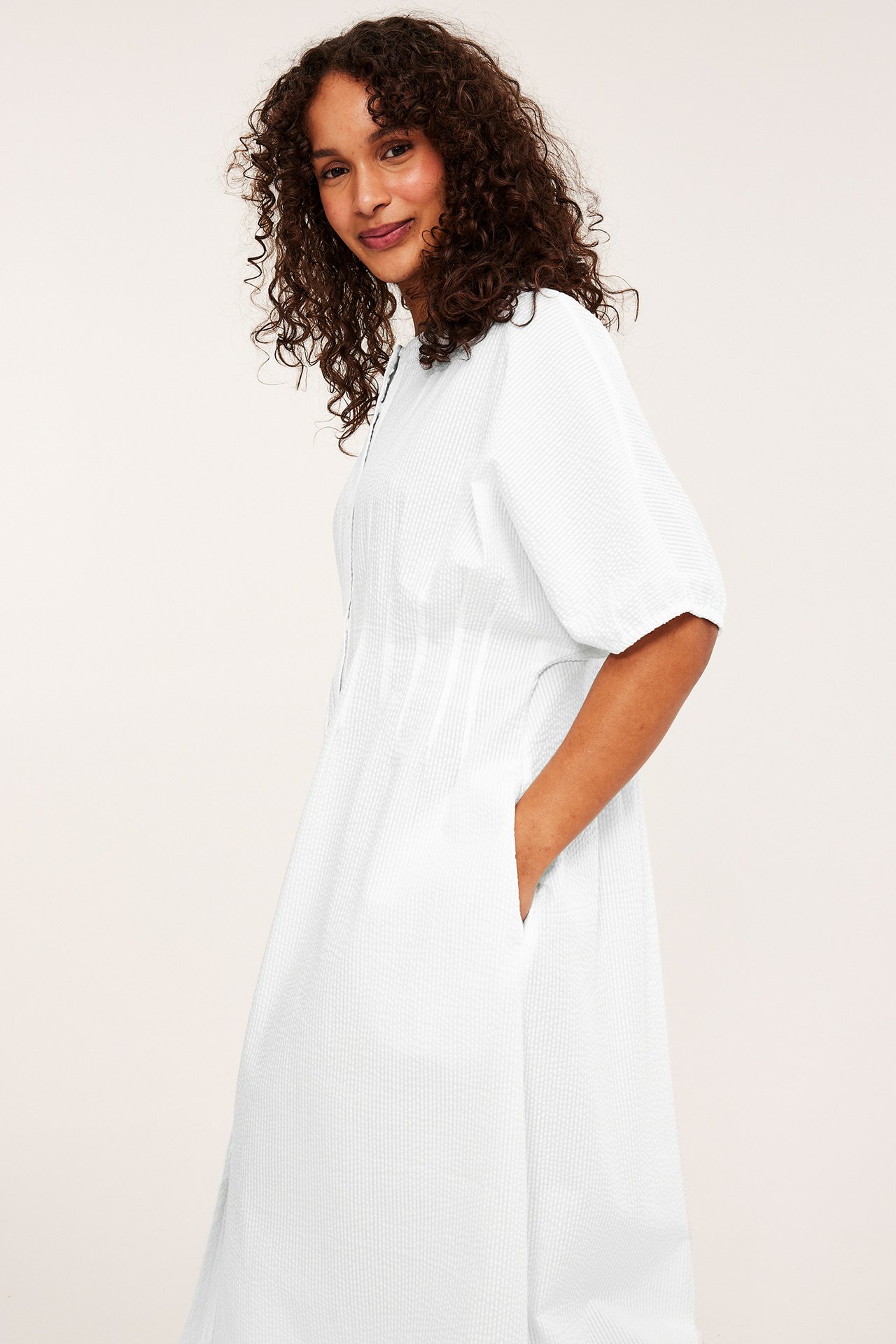 Front view: Kvinna i benvit ribbad midiklänning med ballongärmar och knytband, håller mörkbrun clutch.