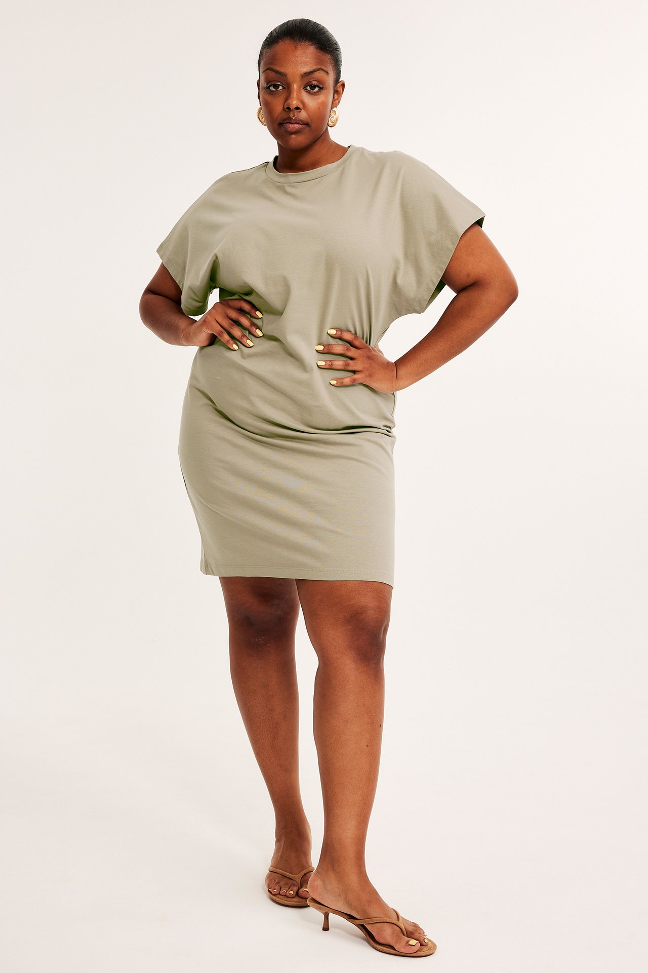 Framifrån, kvinna i svart ribbstickad klänning med utställda ärmar och silverfärgade örhängen.