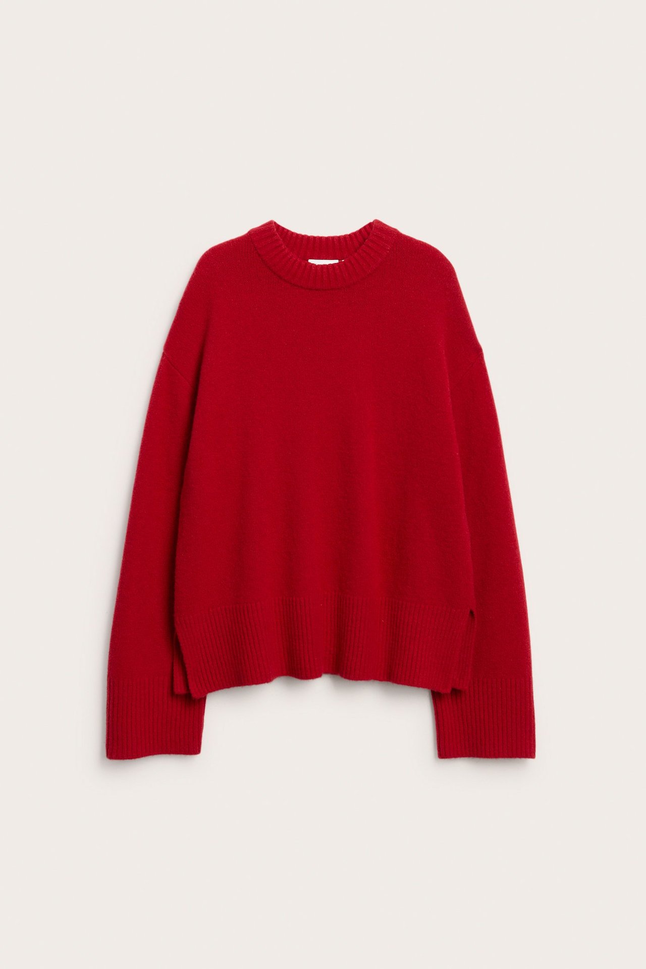 Stickad tröja med rund halsringning. Rak modell med långa ärmar.