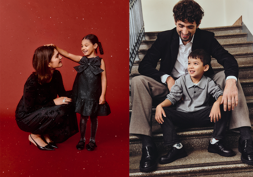 Kollektionen innehåller säsongens favoriter – från välsittande kostymer och elegant festmode som glittrande klänningar, till mjuka stickade tröjor och matchande pyjamasar för hela familjen. Olika texturer, klassiska rutor och mjuka material sätter tonen, medan färgpaletten blandar varma neutrala nyanser med djupa röda toner, midnattsvitt och eleganta metalliska inslag för en sofistikerad julkänsla.